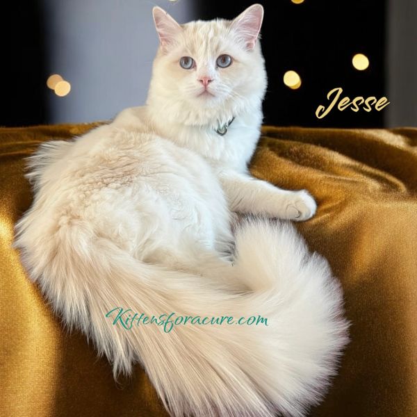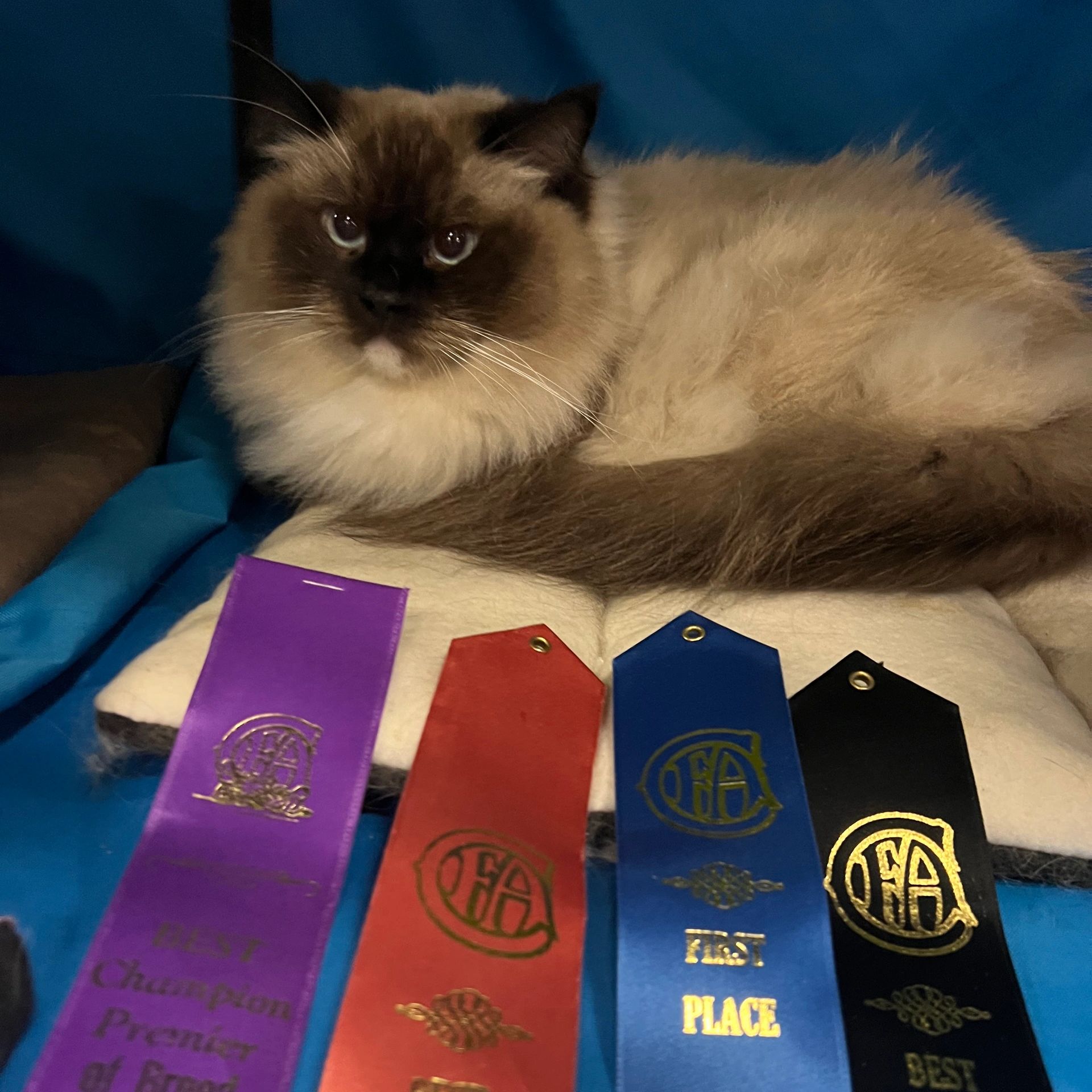 Jesse is a rare lilac boy. He is from Sweden and I flew to Denmark to pick him up to join our cattery! He is bringing quality lines and unique coloring to our cattery. Babies expected summer-fall 2025 from Jesse. He has a special name as my Danish grandfathers name was Jessen and we wanted to honor that heritage. He had his first litter with Suzy Q in April 2025.