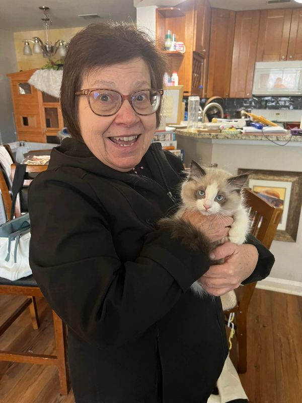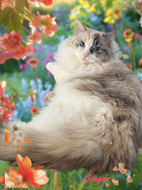 Jinger Is from Poland and was born in 2024.  She is a seal torbie ( a tortie and lynx) and will be able to have flame, lilac and chocolate babies. Her father is an enormous flame. Her babies are going to be large and fluffy. She is crazy about feathers! You will always find her hanging out on the feet of my recliner.